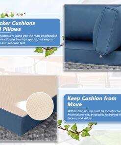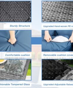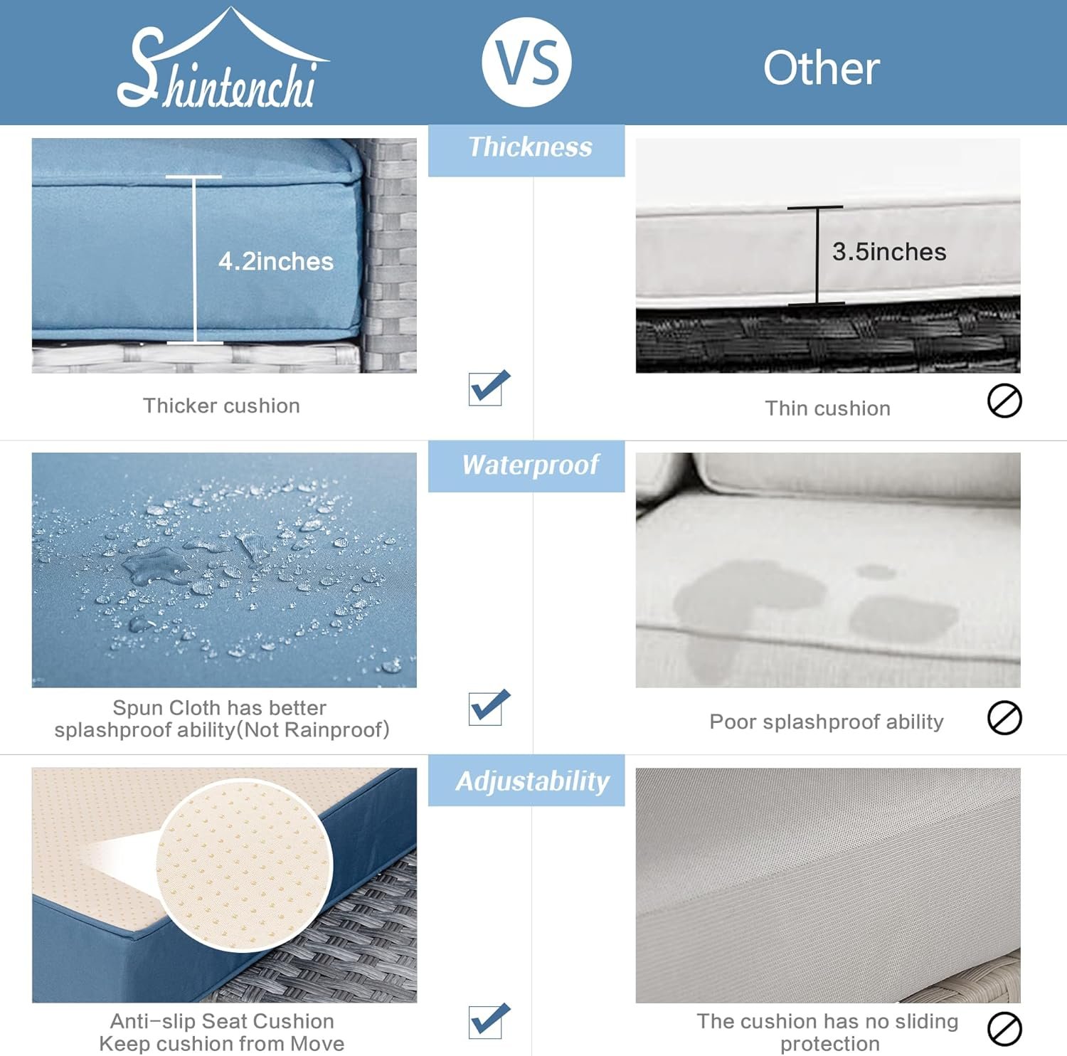 5 Pieces Outdoor Patio Sectional Sofa Couch, Silver Gray PE Wicker Furniture Conversation Sets with Washable Cushions & Glass Coffee Table for Garden, Poolside, Backyard (Aegean Blue)