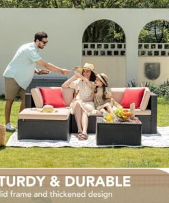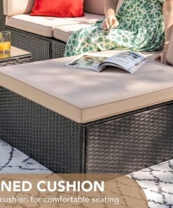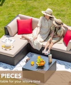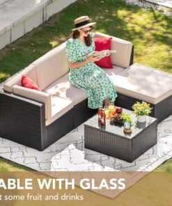 5 Pieces Patio Furniture Sets All Weather Outdoor Sectional Patio Sofa Manual Weaving Wicker Rattan Patio Seating Sofas with Cushion and Glass Table(Beige)
