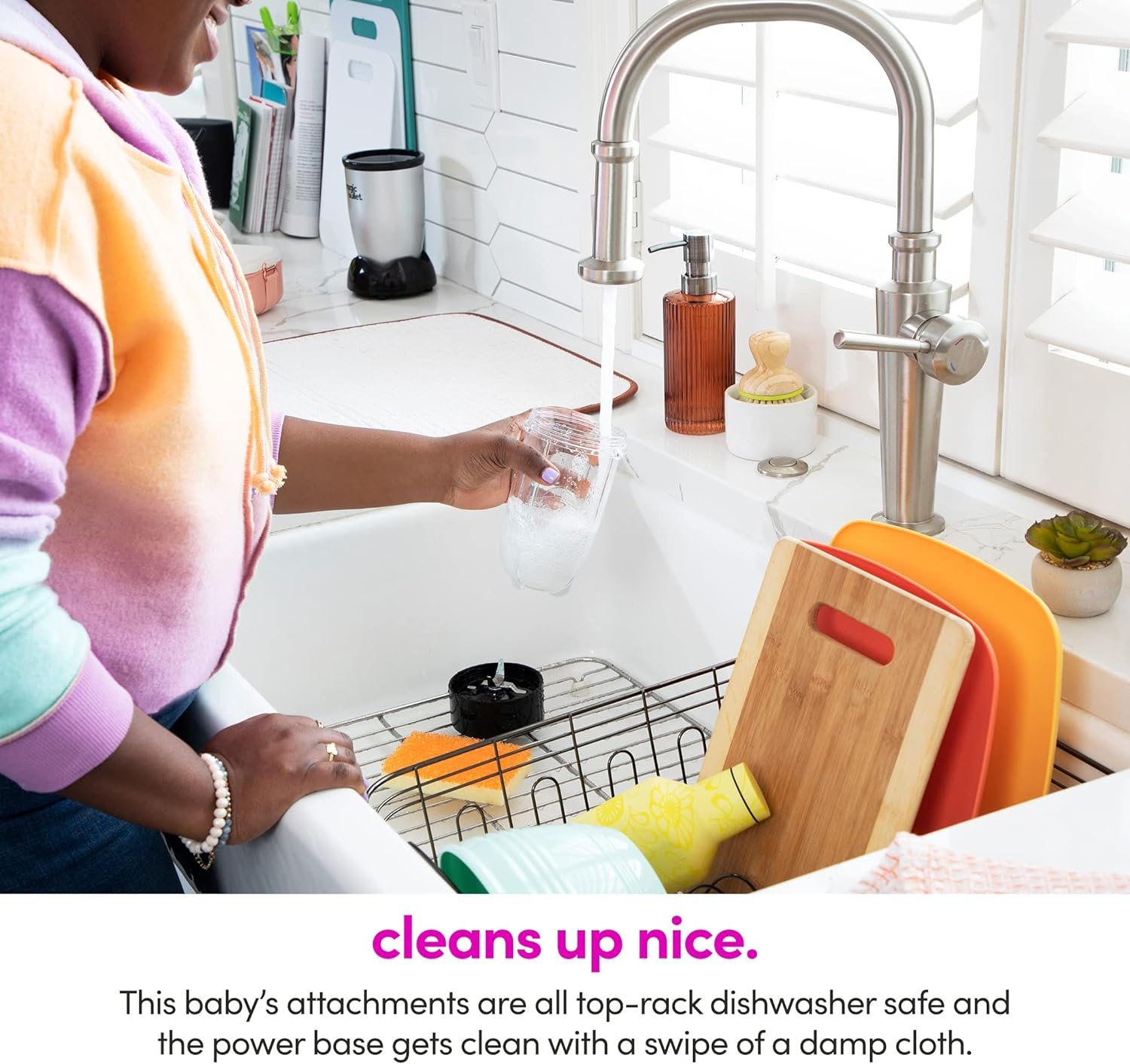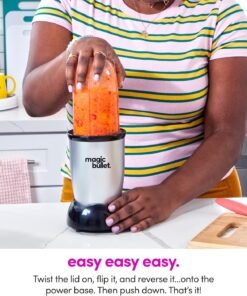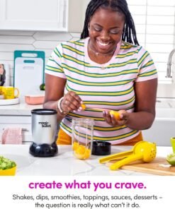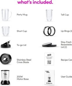 • Included: (1) 250W motor base, (1) cross-blade, (1) tall cup, (1) short cup, (1) party mug, (2) lip rings, (2) Stay-Fresh resealable lids, (1) to-go lid and 10-second recipe guide.