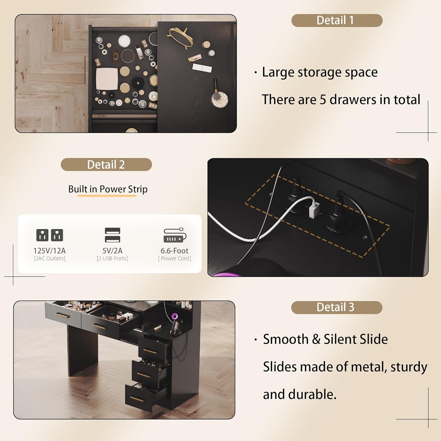 Makeup Vanity with Lights & Charging Station, Black Vanity Table with 5 Drawers & Open Storage Shelves, Bedroom Makeup Dressing Table Set for Women Girls Golden Handles