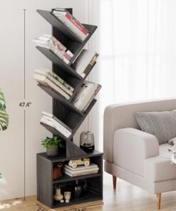 6 Tier Tree Bookshelf, Small Bookcase with Storage Cabinet, Modern Tall Narrow Bookshelves Organizer, Floor Standing Book Shelf for Bedroom/Living Room/Home Office/Corner, Rustic Brown